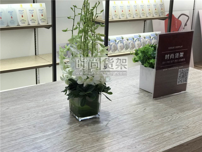 整個設計均采用金麗聲貨架設計生產的【母嬰店貨架系列】,包括中島貨架,單面貨架,時尚吧臺座椅,定制促銷展臺,房型創意展架等。