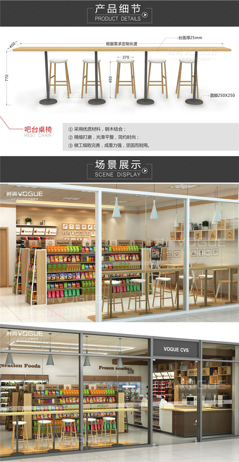 • 產品描述:此款便利店休閑吧臺桌椅配色清新,色澤明亮,能有效提升便利店整體展示形象。